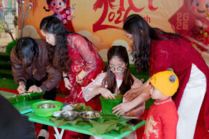Tại chương trình, các con được trực tiếp trải nghiệm gói bánh chưng, tìm hiểu về câu chuyện hoàng tử Lang Liêu và ý nghĩa của Tết cổ truyền Việt Nam.