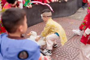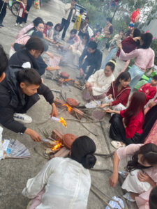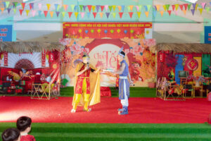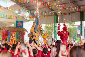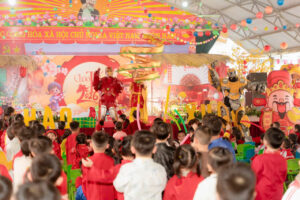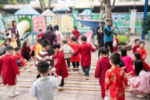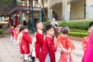 Hoạt động giúp trẻ hiểu thêm về sự đoàn viên, lòng biết ơn và truyền thống dân tộc. Bên cạnh đó là chuỗi trò chơi dân gian sôi động như kéo co, nhảy bao bố, bịt mắt bắt dê, ném còn… mang lại tiếng cười rộn rã khắp sân trường.